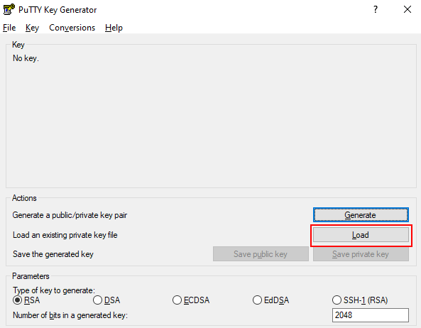 搜索到PuttyGen程序,单击“Load”按钮,如下图所示